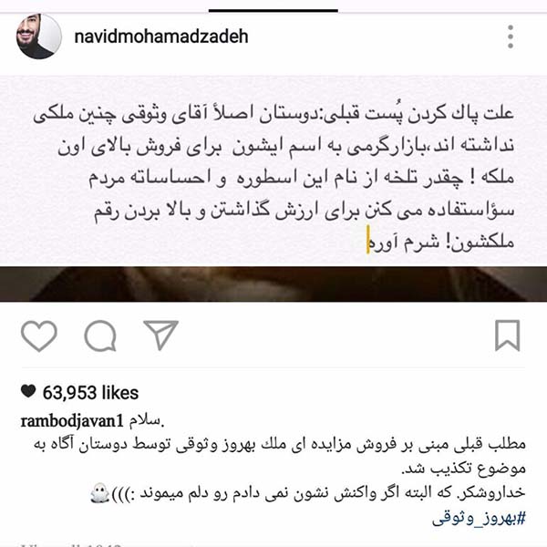 او پس از آنکه از کذب بودن این خبر مطلع شد پست دیگری با این همان عکس منتشر کرد و نوشت: «سلام. مطلب قبلى مبنى بر فروش مزايدهاى ملك بهروز وثوقى توسط دوستان آگاه به موضوع تكذيب شد. خدا رو شكر. كه البته اگر واكنش نشون نمىدادم رو دلم ميموند.»