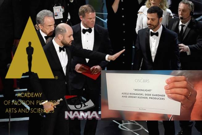 این اشتباه زمانی روی داد که یک پاکت اشتباه به وارن بیتی اعطاکننده جایزه پایانی هشتاد و نهمین دوره جوایز اسکار داده شد. بیتی کارت را به فی داناوی داد و او "لا لا لند" را به عنوان برنده اسکار بهترین فیلم اعلام کرد. چند لحظه بعد به تهیهکنندگان "مهتاب" اطلاع داده شد که در واقع فیلم آنها برنده بالاترین افتخار مراسم شده است.